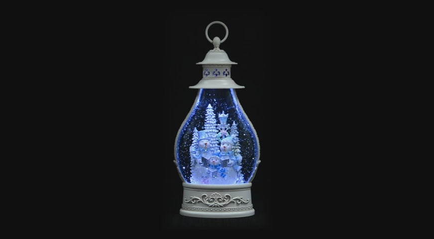 This elegant LED-lit white lantern plays classic holiday tunes while swirling snow brings the festive display of caroling snowmen to life.