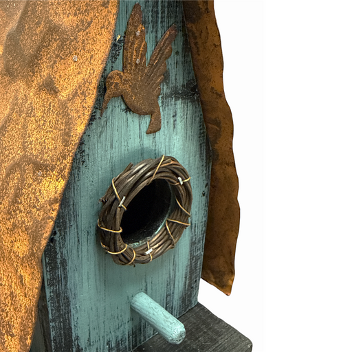 Berry Hill10" Blue Birdhouse with Rusted Roof A charming rustic birdhouse crafted from wood with a weathered metal roof. The 10" blue finish adds a pop of co...