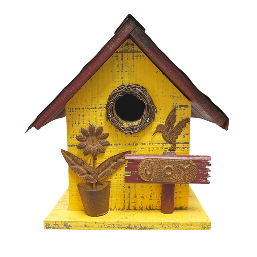 Berry Hill8.5" Yellow Joy Birdhouse Bright and cheerful 8.5" yellow wooden birdhouse featuring a metal roof and decorative metal accents. A playful, eye-catc...