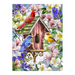 Bring the beauty of nature to life with this elegant 500-piece jigsaw puzzle. Featuring a charming wooden birdhouse surrounded by vibrant flowers and visited by colorful birds - a red cardinal, a bluebird, and a goldfinch - this serene scene is perfect for bird and garden enthusiasts.