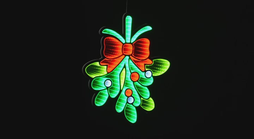 This 18.5" hanging mistletoe features a glowing LED infinity light effect for a bright and festive display. A charming holiday accent for indoor décor. Plug-in operation.