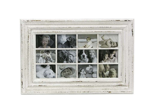 Berry HillDistressed White/Black Picture Frame - 12 PicturesAntiqued Wood Picture Frame. 12 4x6 openings. 38x25"Comes in your choice of Black or White!