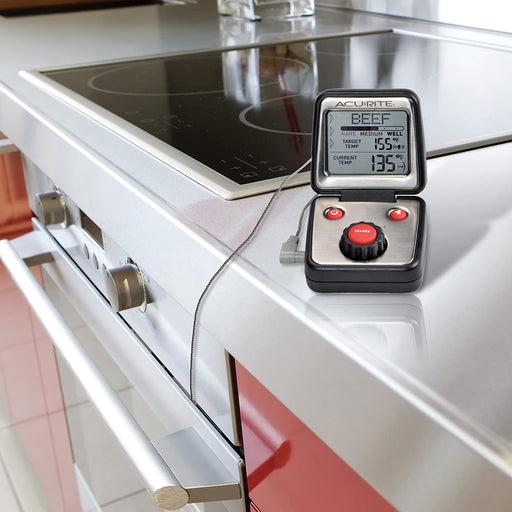 AcuRite Digital Cooking & Barbecue Thermometer allows you to monitor the temperature of the food you are cooking while the oven, grill, smoker, or bbq door or lid is closed. The stainless steel probe measures internal food temperature during cooking and features a 3-feet length 700 degree Fahrenheit heat resistant cord. Easy-set rotary dial lets you select one of the USDA recommended temperature presets or set your own custom temperature. Measures temperature from 14°F to 450°F (-10°C to 232°C)