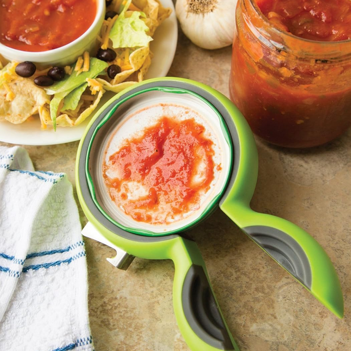 Featuring comfortable handles, a built-in bottle opener, and a handy jar pry on the side.
