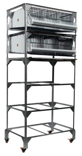 Quail Breeding Pen (Without Pens). Dropping Pan Supports included. (For use with No.0303 Breeding Pen) -Now you can purchase No. 0316 Battery Stand (left) along with 1,2 or 3 of the No. 0303 3 section Quail Breeding Pen, along with one dropping pan (below) for each breeding pen. When more breeding pens are desired, just order No. 0303 along with a dropping pan and add it into your battery stand. (For use with No. 0303 Breeding Pen) SHOWN WITH OPTIONAL WHEELS, ITEM #00319 (NOT INCLUDED). Pens shown are not included.