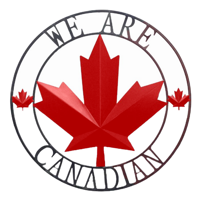 "We Are Canadian" round wall art, made from heavy metal and painted for a long lasting durable finish.